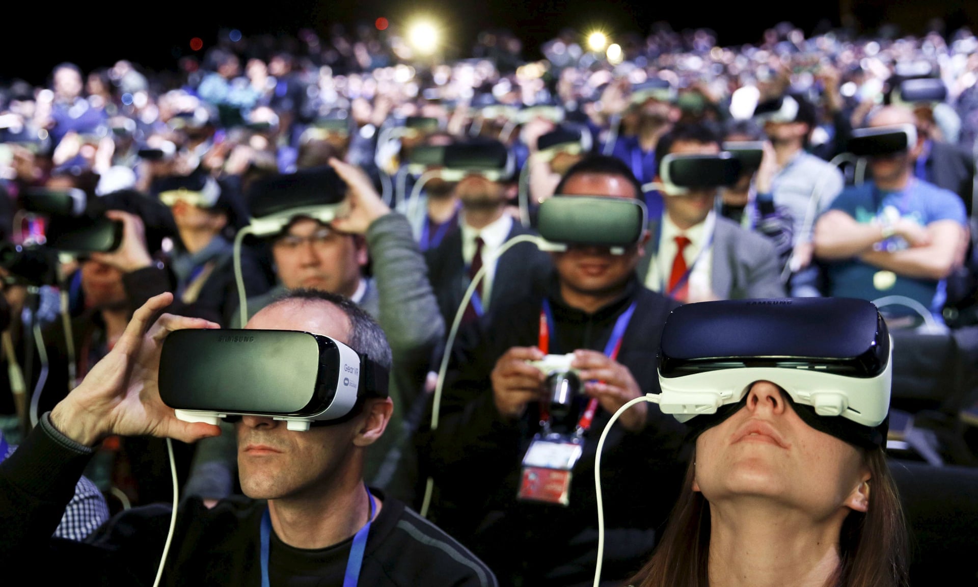 | People try out Samsung Gear VR headsets, the kind used by gynecologist Ralph Anderson, at a technology conference. Photograph: Albert Gea/Reuters |